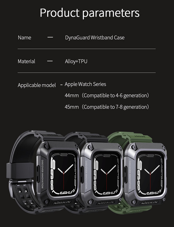 قاب ساعت هوشمند اپل واچ 44 میلی متری نیلکین مدل DynaGuard Wristband دارای طراحی بسیار عالی و قوی شبیه به زره های مکانیکی تولید شده که دارای ظاهری بسیار زیبا و شیک دارد.